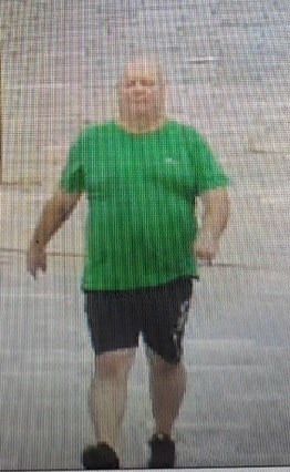 Male 1 is described as a white male, bald, heavy build wearing a green t-shirt, black shorts, and black footwear.