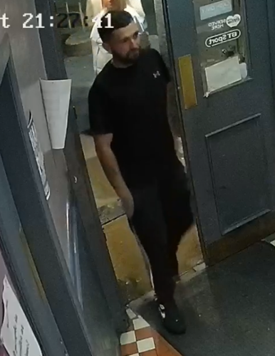 The first man, pictured below, is described as white, aged 35 to 45-years-old with dark hair and beard. He was wearing a black Under Armour T-shirt and Adidas jogging bottoms.
